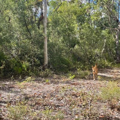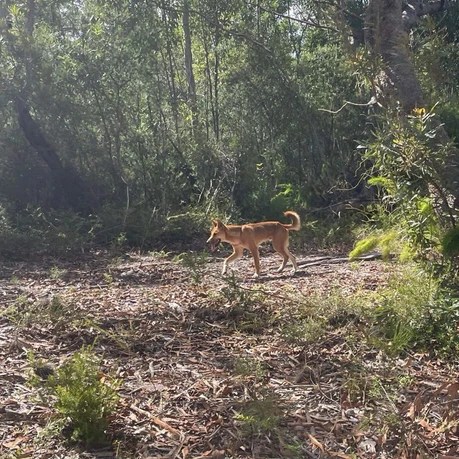 Wongari or dingos are a native species that are protected wildlife in Queensland. On K’Gari, wongari are usually a golden sandy colour and are about the size of a medium domestic dog (Queensland Government, 2024). Many of the wongari have a coloured tag in their ear for tracking and conservation/management purposes.