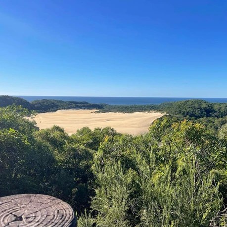 From Lake Wabby, it is a short climb up to the lookout which oversees views of Lake Wabby and Hammerstone Sandblow, with the ocean visible in the background. Due to the constant migration of the exposed sands, this view is ever-changing as winds blow more and more sand into Lake Wabby, reclaiming sandy territory (Queensland Government, 2023).